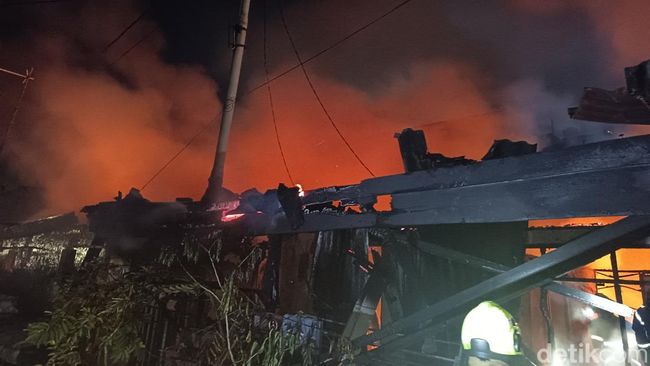 Pantauan detikSulsel, Selasa (22/7/2025) pukul 19.28 Wita, di Kelurahan Mappala, Kecamatan Rappocini, tampak api masih membara. Sejumlah petugas Damkarmat terlihat berupaya memadamkan kobaran api.