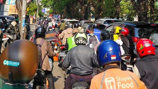 Sejumlah kendaraan pun saling bersaut klakson karena antrean yang cukup panjang. Kendaraan saat ini hanya bisa bergerak perlahan.