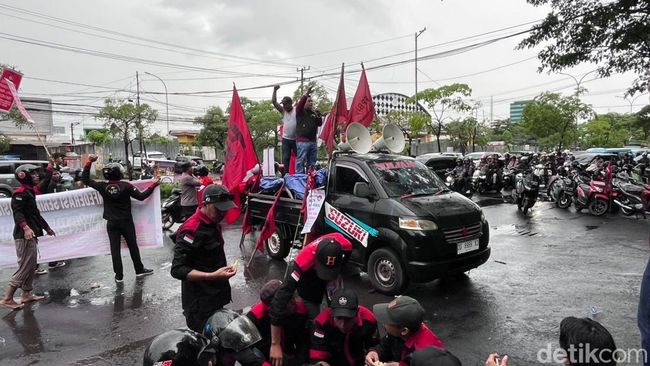Sejumlah massa dari Konfederasi Serikat Nasional (KSN) menggelar aksi demonstrasi di depan Kantor Gubernur Sulawesi Selatan (Sulsel) sore ini. Kemacetan pun tidak terhindarkan di lokasi.