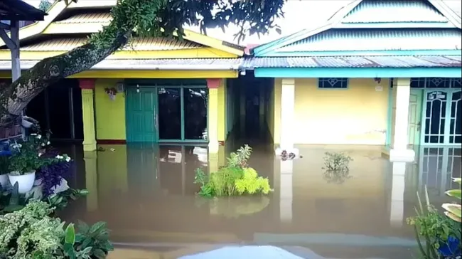 "Subuh tadi jam 4 mulai banjir, waktu hujan deras. Air langsung masuk rumah sekitar sebetis 30 senti. Basah semua, mulai kasur sama kursi karena tidak sempat di tangani orang tidur semua," ucapnya.