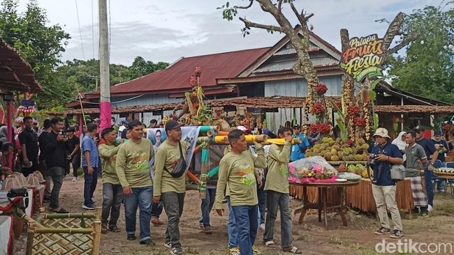 Pantauan detikSulsel di objek wisata Kambo, Kelurahan Kambo, Kecamatan Mungkajang, Palopo pada Sabtu (9/3/2024), aneka buah dipamerkan para petana di sepanjang jalan masuk. Buah yang disajikan mulai dari durian, rambutan, langsat, manggis hingga pisang.