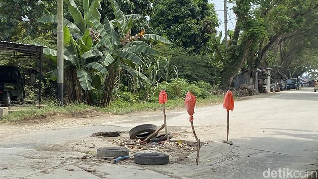"Pengendara roda dua pernah jatuh di situ, mungkin dia tidak lihat itu lubang. Makanya kami pasangi tanda di situ. Dulu sebelah sininya rusak tapi sudah diperbaiki, sekarang sebelah sananya lagi rusak," kata salah seorang warga di lokasi, Chandra.