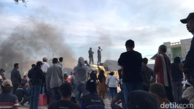 Massa aksi unjuk rasa menutup salah satu lajur jalan menggunakan truk dan ban yang dibakar. Aparat kepolisian terlihat melakukan penjagaan dan mengatur arus lalu lintas yang mengalami kemacetan.