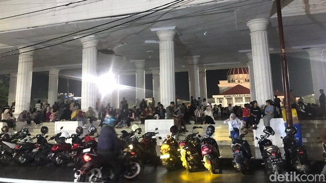 Tampak pengunjung berteduh di aula utama Lapangan Pancasila. Sebagian juga berteduh di lapang pedagang UMKM.