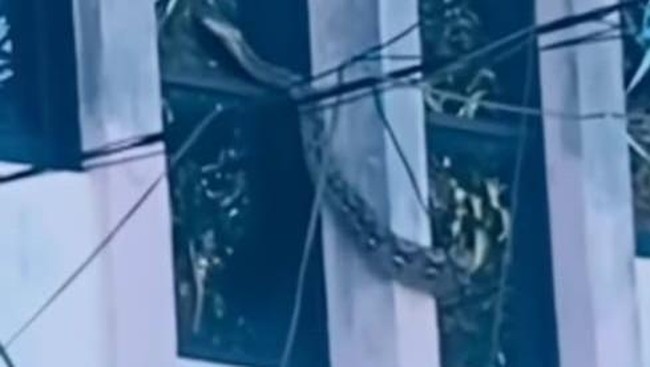 Dalam video beredar, tampak ular piton merayap di dinding sebuah ruko di dalam pasar. Seorang pria lalu muncul dari jendela hendak menangkap ular tersebut.