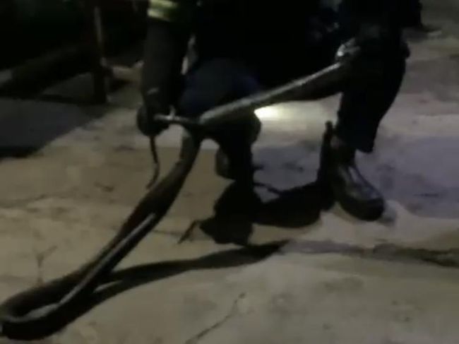 Hewan berbisa tersebut sempat melakukan perlawanan. Saat tertangkap menggunakan tongkat khusus, ular king cobra tersebut tampak diletakkan di lantai sebelum akhirnya dievakuasi petugas damkar.