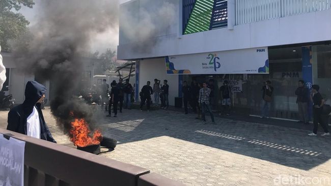 Aksi demonstrasi dimulai dengan menyegel pagar kantor pembiayaan menggunakan gembok. Massa kemudian membentangkan spanduk di pagar bertuliskan 'Gedung Ini Disegel'. Massa juga membakar ban dan menempelkan kertas bergambar mafia di pagar kantor pembiayaan tersebut.