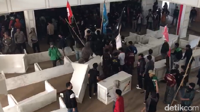 Namun situasi mulai tidak terkendali ketika para demonstran memaksa masuk ke gedung wakil rakyat tersebut sekitar pukul 16.00 Wita. Sesampainya di ruang paripurna, para mahasiswa membanting meja dan kursi.