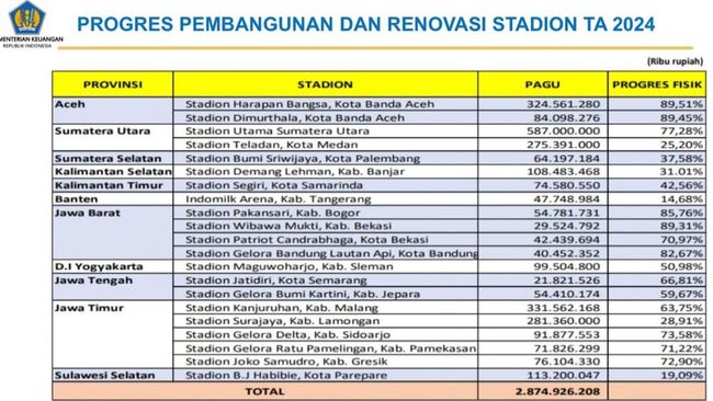 "Tahun 2024 ini APBN dengan anggaran Rp 2,874 triliun membiayai renovasi dan pembangunan 21 stadion di berbagai lokasi di Aceh-Sumatera Utara-Sumatera Selatan-Jawa Barat-Banten-Jawa Tengah-Jawa Timur-DI Jogyakarta-Sulawesi Selatan-Kalimantan Selatan dan Kalimantan Timur," tulis Sri Mulyani.