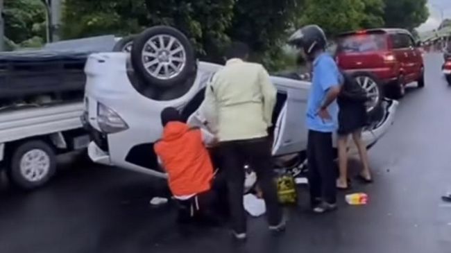 Sebuah mobil mengalami kecelakaan tunggal dengan menabrak pembatas jalan hingga terbalik di depan Kantor Wali Kota Parepare, Sulawesi Selatan (Sulsel). Akibatnya sopir inisial AG (24) dan penumpangnya wanita inisial AR (21) mengalami luka ringan.