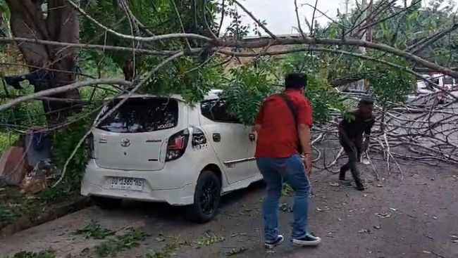 Empat pohon tumbang akibat diterjang angin kencang dan hujan deras di Kota Parepare, Sulawesi Selatan (Sulsel). Salah satu pohon tumbang menimpa sebuah mobil di jalanan.