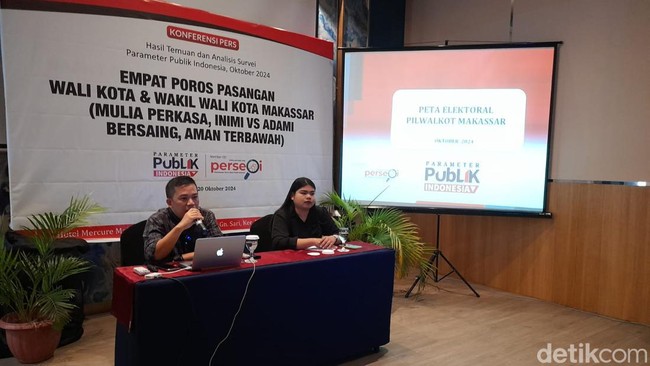 Lembaga survei Parameter Publik Indonesia (PPI) merilis hasil survei elektabilitas empat pasangan calon (paslon) pada pemilihan wali kota (Pilwalkot) Makassar 2024. Survei PPI memotret paslon nomor urut 1 Munafri Arifuddin-Aliyah Mustika Ilham (MULIA) dengan elektabilitas tertinggi.