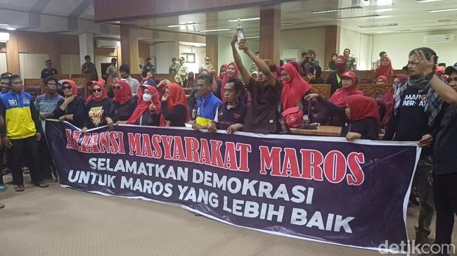 Dalam aksinya, massa tidak sempat bertemu dengan Marjan. Massa pun akhirnya memaksa masuk ke ruang paripurna DPRD Maros. Massa membentangkan spanduk yang bertuliskan aspirasi mereka.