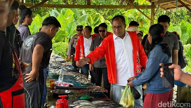 Danny mengunjungi Pasar Tampinna, Desa Turunan Bajo, Kecamatan Angkona, Lutim, Selasa (5/11/2024). Danny diadang warga yang menanyakan visi misi tersebut saat menelusuri lorong penjual ikan di pasar.