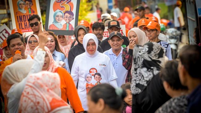Warga menyambut antusias kehadiran calon wali Kota Makassar nomor urut 3, Indira Jusuf Ismail di Kecamatan Tamalate, Kota Makassar, Sulawesi Selatan (Sulsel). Teriakan 'teruskan kebaikan' terdengar nyaring saat Indira blusukan ke lorong-lorong.