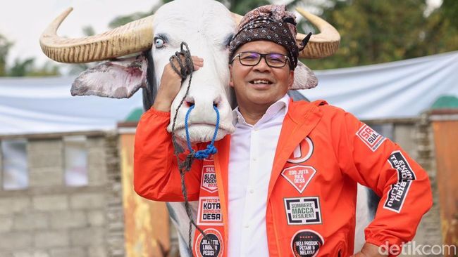 Calon Gubernur Sulawesi Selatan (Cagub Sulsel) nomor urut 1 Moh Ramdhan 'Danny' Pomanto menyempatkan berfoto dengan tugu Tedong Bonga saat kampanye di Luwu Utara. Danny menilai Tedong Bonga menjadi simbol persatuan dan memperkuat tradisi di Sulsel.