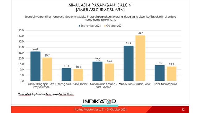 Sementara pada Oktober, elektabilitas Sherly-Sabrin naik signifikan menjadi 40,7%. Berbeda dengan Husain-Asrul yang justru turun menjadi 20,7%. Kemudian ada Kasuba-Basri 15,5% dan Aliong-Sahril 10,4%.