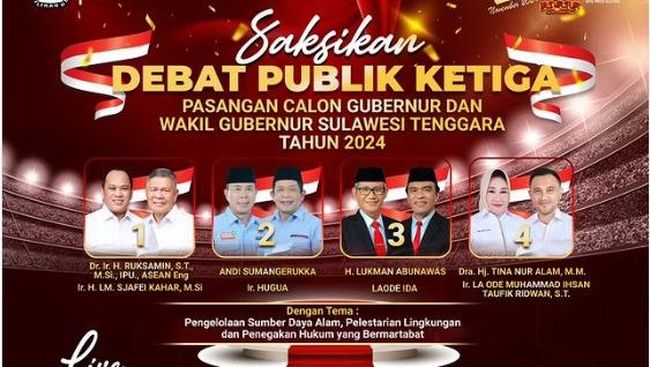 Debat ketiga pemilihan Gubernur dan Wakil Gubernur Provinsi Sulawesi Tenggara (Sultra) 2024 akan berlangsung hari ini. Pelaksanaan debat pamungkas ini akan disiarkan langsung secara nasional oleh Trans TV.