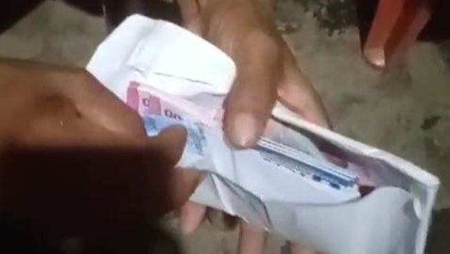 Sementara 1 pria lainnya memegang plastik berwarna hijau yang berisi amplop. Terlihat ketiga pria itu berada dalam sebuah rumah dan dikelilingi sejumlah warga.