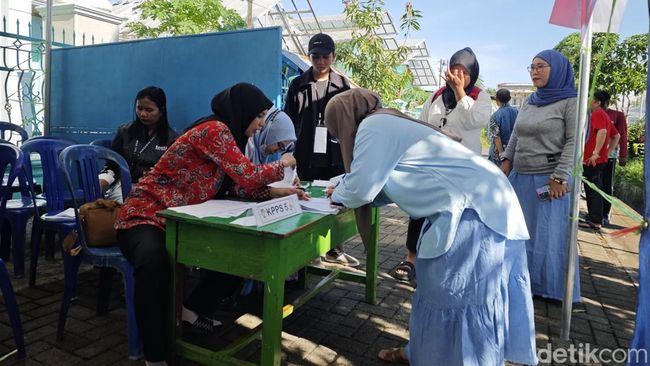 Warga yang datang langsung dilayani petugas penyelenggara pemungutan suara (KPPS). Terlihat sejumlah warga mengantre di meja registrasi menunggu giliran mencoblos. Proses pencoblosan berlangsung dengan tertib.