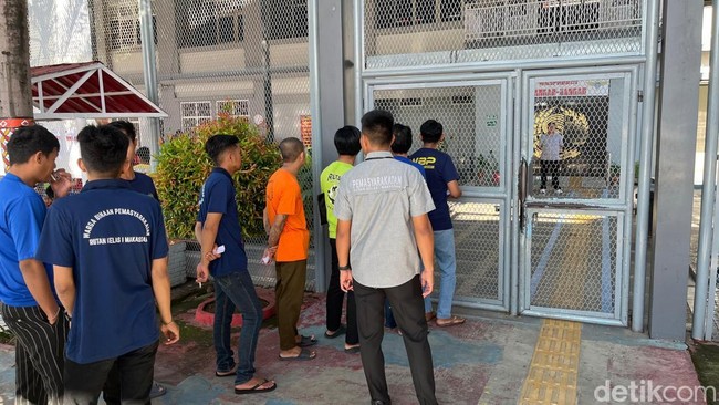 Pantauan detikSulsel, Rabu (27/11/2024) di Rutan Kelas I Makassar, Jalan Rutan Nomor 8, Kelurahan Gunung Sari, Kecamatan Rappocini, tampak para napi mengantre di depan TPS. Mereka mengenakan baju tahanan berwarna biru gelap dan orange.