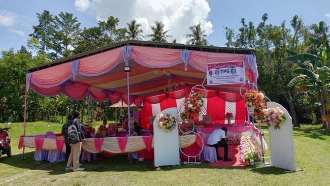 TPS ini didekorasi ala pesta pengantin dengan dominan warna pink dan ungu. Rumput yang berada di bawa tenda ditutupi dengan karpet, sementara kursi diberi sarung dan ditata rapi.