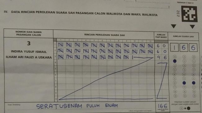 " (Hasilnya) 162 (suara) paslon 1 (Appi-Aliyah), 27 (suara) paslon 2 (Seto-Rezki), 166 (suara) paslon 3 (Indira-Ilham), paslon 4 (Amri-Rahman) 4 suara," ujar salah satu anggota Kelompok Penyelenggara Pemungutan Suara (KPPS) TPS 001.