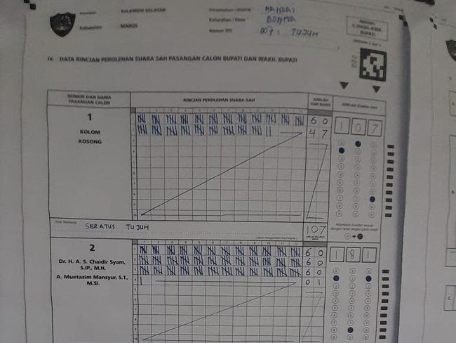 Calon bupati dan wakil bupati Maros, Chaidir Syam dan Muetazim Mansyur unggul di TPS 07, Kelurahan Bontoa, Kecamatan Mandai, Kabupaten Maros, Sulawesi Selatan (Sulsel). TPS tersebut merupakan tempat Wakil Bupati Maros Suhartina Bohari menyalurkan hak pilihnya.