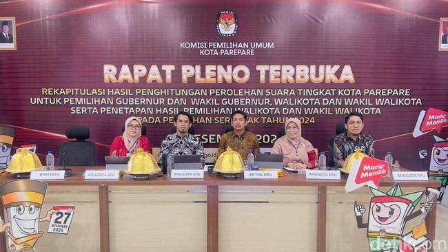 "Kami telah melaksanakan rapat terbuka rekapitulasi perhitungan perolehan suara untuk pemilihan gubernur dan wakil wakil gubernur dan sekaligus hasil perolehan langsung kami tetapkan untuk jenis pemilihan wali kota dan wakil wali kota," kata Ketua KPU Parepare Muh Awal Yanto kepada wartawan, Selasa (3/12/2024).