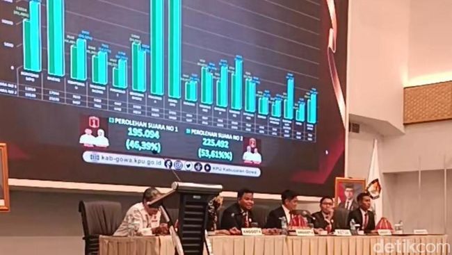 "Menetapkan pasangan calon bupati dan wakil bupati terpilih dalam pemilihan bupati dan wakil bupati Gowa 2024 adalah sebagai berikut atas nama Sitti Husniah Talenrang-Darmawangsyah Muin nomor urut 2 perolehan suara 225.492," ujar Fitra saat membacakan berita acara.