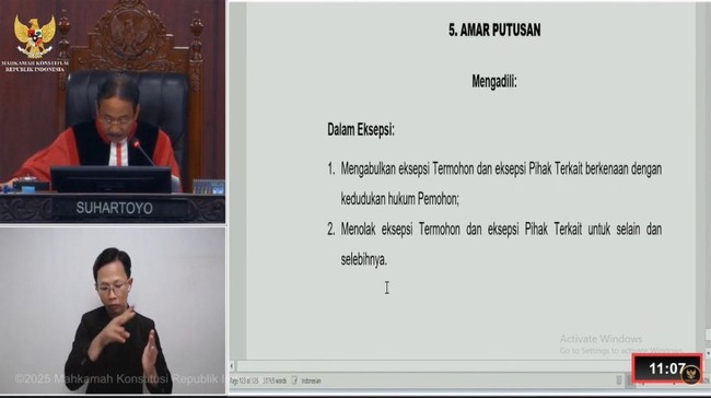 "Satu, mengabulkan eksepsi termohon dan eksepsi pihak terkait berkenaan dengan kedudukan hukum pemohon. Dua, menolak eksepsi termohon dan eksepsi pihak terkait untuk selain dan selebihnya. Dalam pokok permohonan, permohonan pemohon tidak dapat diterima," pungkas Suhartoyo diiringi ketukan palu.