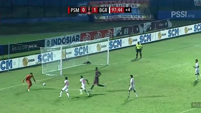 Persikabo mendapat kesempatan lewat tendangan penalti di menit ke-93. Bola yang dieksekusi oleh Ryan Kurnia berhasil membobol gawang di arah kiri gawang PSM Makassar. DIky terkecoh melompat ke sebelah kanan.