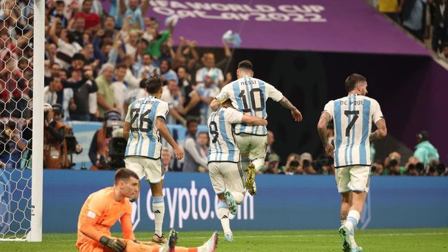 Argentina ke final Piala Dunia 2022 usai mengalahkan Kroasia dengan skor 3-0 di Lusail Iconic Stadium, Lusail, Rabu (14/12). Messi mencetak gol lewat penalti dan disusul 2 gol dari Julian Alvarez.