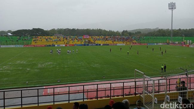 Tampak sejumlah penonton di area tribun terbuka juga mencari tempat berteduh. Meski ada juga penonton yang sudah siaga dengan menggunakan mantel dari plastik.