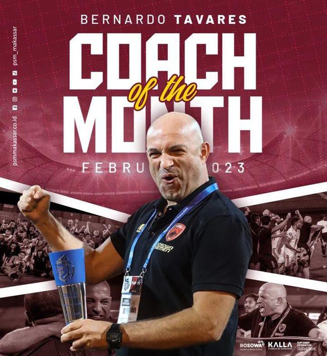 "Bernardo Tavares dinobatkan sebagai best coach #BRILiga1 edisi Februari 2023 oleh @liga1match. Congrats coach @bernardotavares80," tulis akun Instagram PSM Makassar, Rabu (5/4/2023).