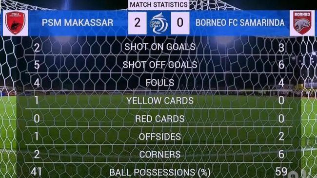 Hingga babak pertama berakhir, tidak ada gol yang tercipta. PSM sementara masih unggul 2-0 atas Borneo FC.
