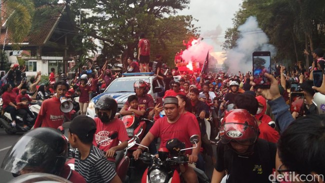 Sejumlah suporter dan warga yang mengenakan pakaian berwarna merah memadati jalan. Mereka menyambut pemain yang membawa piala dengan teriakan.