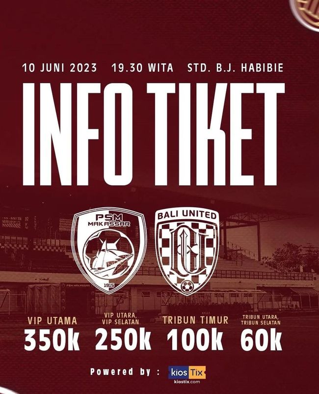 Tiket pertandingan PSM Makassar Vs Bali United hanya dijual online melalui Kiostix.com sebagai vendor penyedia resmi tiket pertandingan PSM. Untuk harga tiket dibagi menjadi 4 kategori: