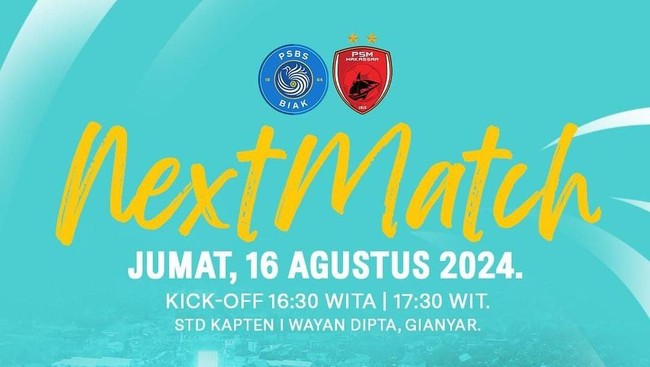 PSBS Biak Vs PSM Makassar berlangsung di Stadion Kapten I Wayan Dipta, Jumat (16/8/2024). Kickoff dimulai pukul 15.30 WIB atau 16.30 Wita.