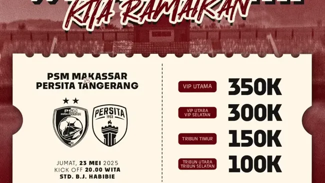 Tiket pertandingan penutup Liga 1 2024/2025 antara PSM Makassar Vs Persita Tangerang sudah mulai dijual. Panitia pelaksana (panpel) pertandingan menyiapkan kuota 7.200 lembar tiket.