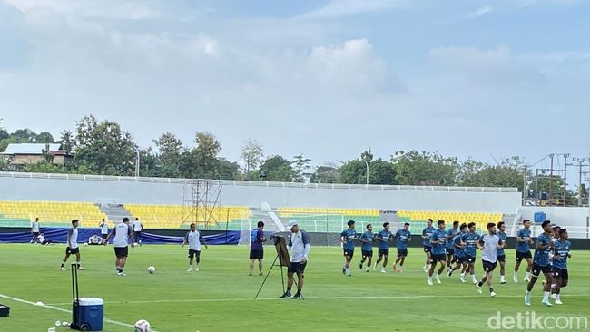 Para pemain juga terlihat memutari lapangan. Sementara itu, dua kiper berlatih melakukan peregangan dan berlatih saving.