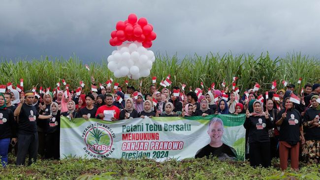 Petani tebu pendukung Ganjar Pranowo yang tergabung dalam Petani Tebu Bersatu (Petebu) di Kabupaten Gowa, Sulawesi Selatan, menggelar silaturahmi dan sarasehan di Lapangan Desa Bontoramba, Kecamatan Pallangga, Kabupaten Gowa, Sulawesi Selatan hari ini.
