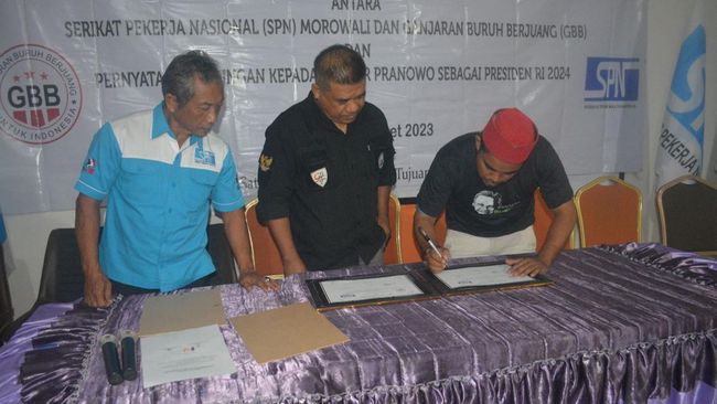 Ganjaran Buruh Berjuang (GBB) bersama Dewan Pimpinan Cabang Serikat Pekerja Nasional (DPC SPN) Kabupaten Morowali melakukan deklarasi dukungan terhadap Ganjar Pranowo sebagai Presiden RI 2024. Dukungan ini ditandai dengan penandatanganan MoU oleh GBB dan DPC SPN.