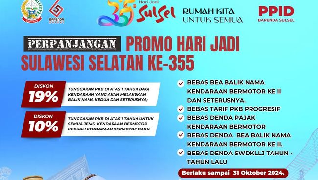 "Kami memberikan diskon hingga 19 persen untuk pembayaran pajak kendaraan. Diskon ini dalam rangka memperingati HUT Sulsel," kata Kepala Bapenda Sulsel Reza Faisal Saleh dalam keterangannya yang dikutip, Minggu (6/10/2024).