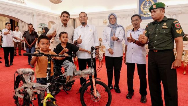 Gubernur Sulawesi Selatan (Sulsel) Andi Sudirman Sulaiman memberikan hadiah sepeda kepada dua bocah, Syamsul (7) dan Muh Aidil (7) usai viral memungut sisa kue pejabat dan undangan usai perayaan HUT ke-80 RI di Kabupaten Gowa. Andi Sudirman terharu dengan aksi kedua bocah yang masih duduk di bangku sekolah dasar (SD) tersebut.