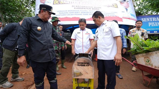 Bantuan itu diserahkan Bahtiar saat peninjauan lahan budidaya pisang Cavendish, di Desa Batugading, Kecamatan Mare, Bone, Rabu (13/3). Alat perajang pisang itu diciptakan Politeknik Akademik Teknik Industri (ATI) Makassar yang mampu mengolah pisang 150-200 kilogram per jam.