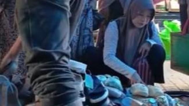 Dalam video beredar, terlihat tiga orang wanita yang sedang melihat-lihat sandal. Kemudian ada seorang emak-emak yang lewat memakai kerudung memperhatikan tas emak-emak yang tengah duduk.
