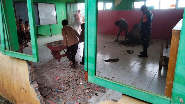 "Akibatnya tembok gedung sekolah bobol, lantai gedung juga beberapa pecah, rusak. Batu itu kemudian menggelinding dari atas gunung dan jatuh masuk ke dalam gedung sekolah," katanya.