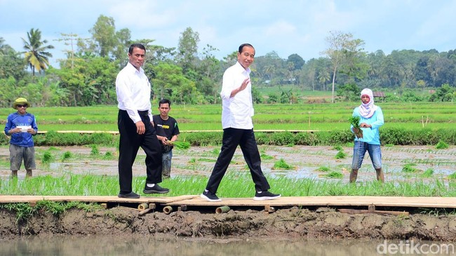 Jokowi berjalan di pematangan sawah dan berhenti di sudut menyapa para petani. Jokowi lalu memanggil petani bernama Andi Musliadi dan menanyakan varietas apa yang ditanam.