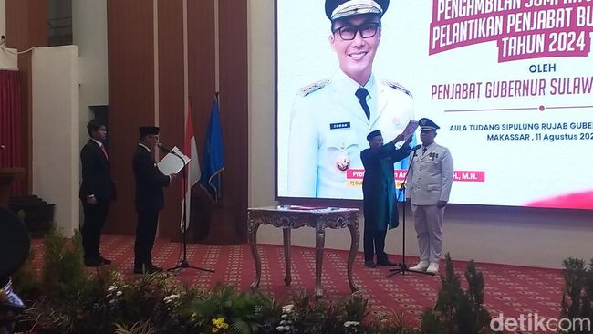 Pelantikan digelar di Aula Tudang Sipulung, Rumah Jabatan Gubernur Sulsel, Jalan Sungai Tangka Makassar, Minggu (11/8/2024) malam. Sejumlah pejabat Pemprov Sulsel, Pemkab Bone, Forkopimda Bone dan keluarga besar Andi Winarno tampak hadir.